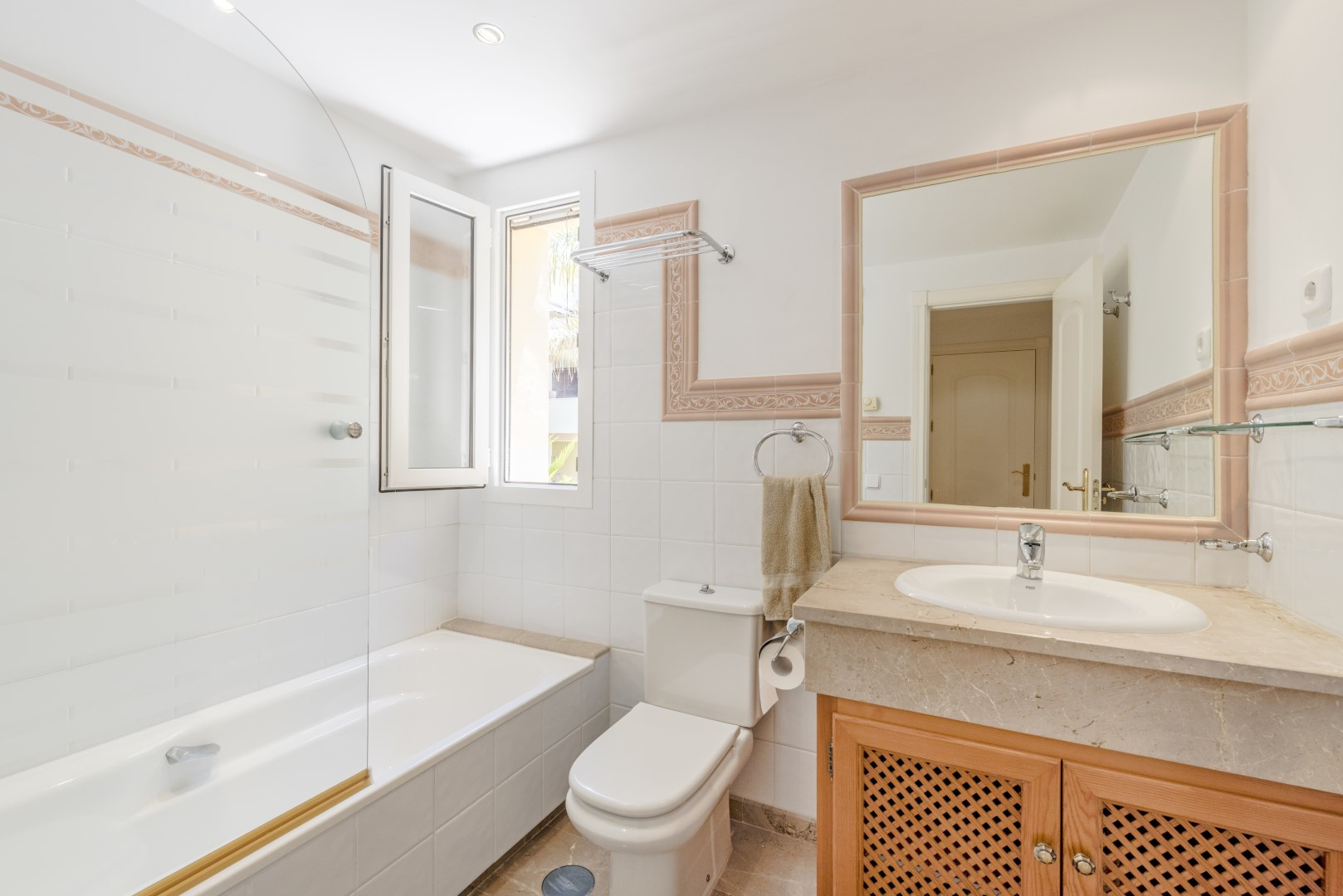 Inside, the apartment boasts a bright and functional layout. The fully fitted kitchen provides ample space for cooking and storage, while the generous living and dining area is designed for both relaxation and entertaining, with direct access to the terrace. The two bedrooms are well-proportioned, complemented by two bathrooms featuring bath and shower combinations, ensuring both practicality and comfort.